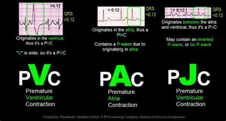 – A PAC is when you have another full contraction (heartbeat) (P, QRS, T) that starts right after you have already have a full contraction (heartbeat) (P, QRS, T). – A PJC is a QRS complex that is 0.12 seconds or less, but does not have a P wave.Click to see full answer. Similarly, it is asked, what is a PJC rhythm?A premature junctional complex (PJC) is an abnormality seen in the presence of an underlying sinus rhythm. It is an aberrant impulse that originates in the atrioventricular junction (junctional tissue) and occurs early or prematurely before the next expected P wave.Likewise, are PACs normal? Premature atrial complexes, or PACs, are “extra” heartbeats that arise within the atria of the heart. PACs are the most common variety of cardiac arrhythmia. In fact, PACs are so common that most people will have them occasionally. Moreover, what is worse PAC or PVC? Premature atrial contractions (PACs) are premature heartbeats that are similar to PVCs, but occur in the upper chambers of the heart, an area known as the atria. PACs do not typically cause damage to the heart and can occur in healthy individuals with no known heart disease.What causes a PJC?PJCs are not often seen in individuals with a healthy heart, but it can occur as result of emotional stress, consumption of caffeine, nicotine, and alcohol, or for no apparent cause. PJCs may occur when AV tissue is irritated or as a result of the following conditions: hypoxia.